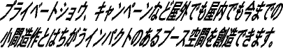 なんといっても搬入と同時に設営完了。建てこみ無しの搬出だけ。イベント企画ご担当者には、新しい何かを実感していただけるレンタルサービスをご提供したいと思います。もちろん日本全国搬入可能!