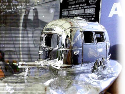 | プラスチックにアルミニウムメッキを施した。BAMBI 1962 モデルのジオラマ風イメージモデルです。ボディー以外をお好みで塗装すると、更にリアルなエアストリームのシーンを再現できます。スケールモデルではないのでプロポーションや細部はアーティストのデフォルメもあり、コミカルな仕上がりです。 |